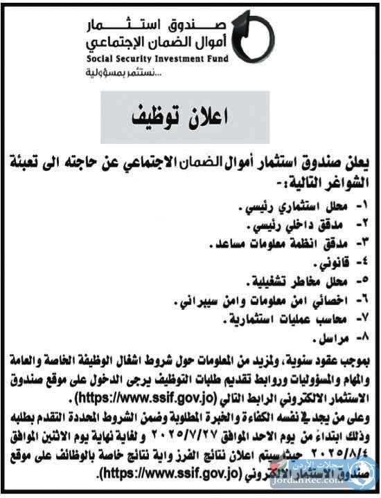 يعلن صندوق استثمار أموال الضمان الاجتماعي عن حاجته الى تعبئة الشواغر التالية :-